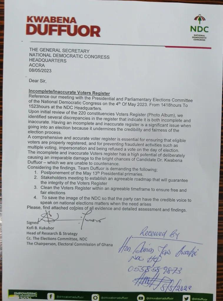 The Head of research and strategy of the Duffuor campaign, Kofi Kukubor who authored the letter, says the postponement will give ample time for the register to be cleaned and an opportunity for a free and fair election.